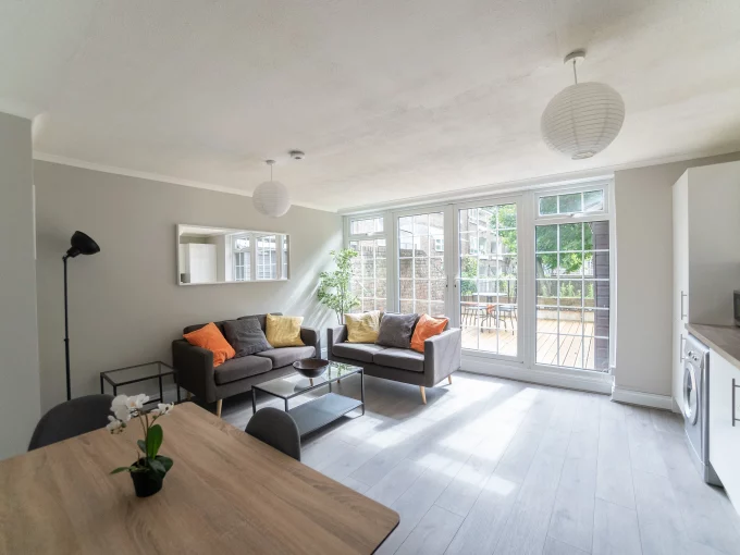 The flat is completely renovated to a high, modern standard throughout. The lounge-diner offers a choice between grabbing a quick snack at the kitchen or sitting down at the dining table to enjoy a meal with company, or a movie on the wall-mounted HDTV. The sleek kitchen is fully loaded with modern appliances, microwave, oven and hob, fridge, freezer, washer-dryer, and dishwasher. The crisp clean bathroom is equally well-equipped with a power shower and a separate toilet just to speed up the process of getting up in the mornings.