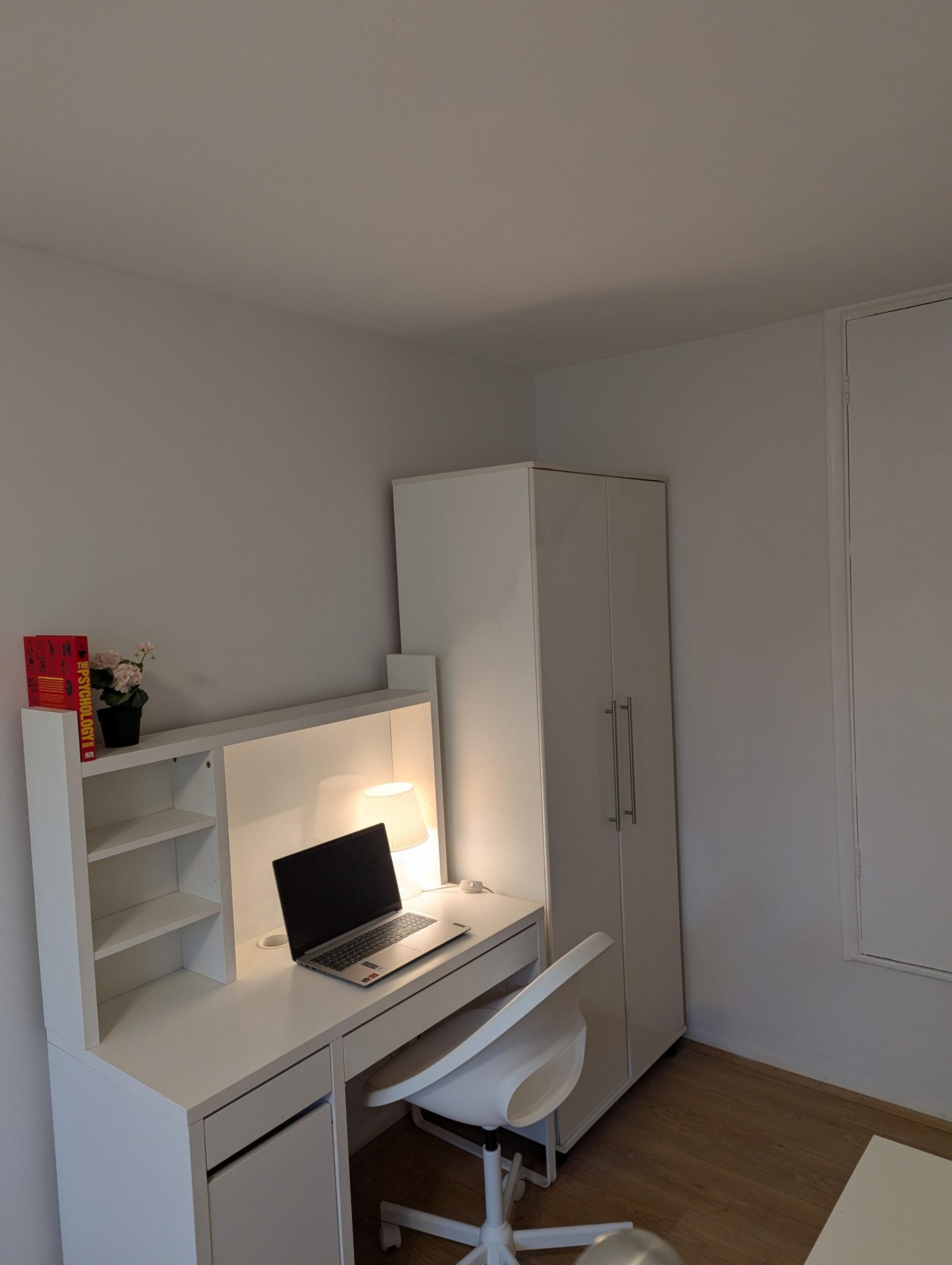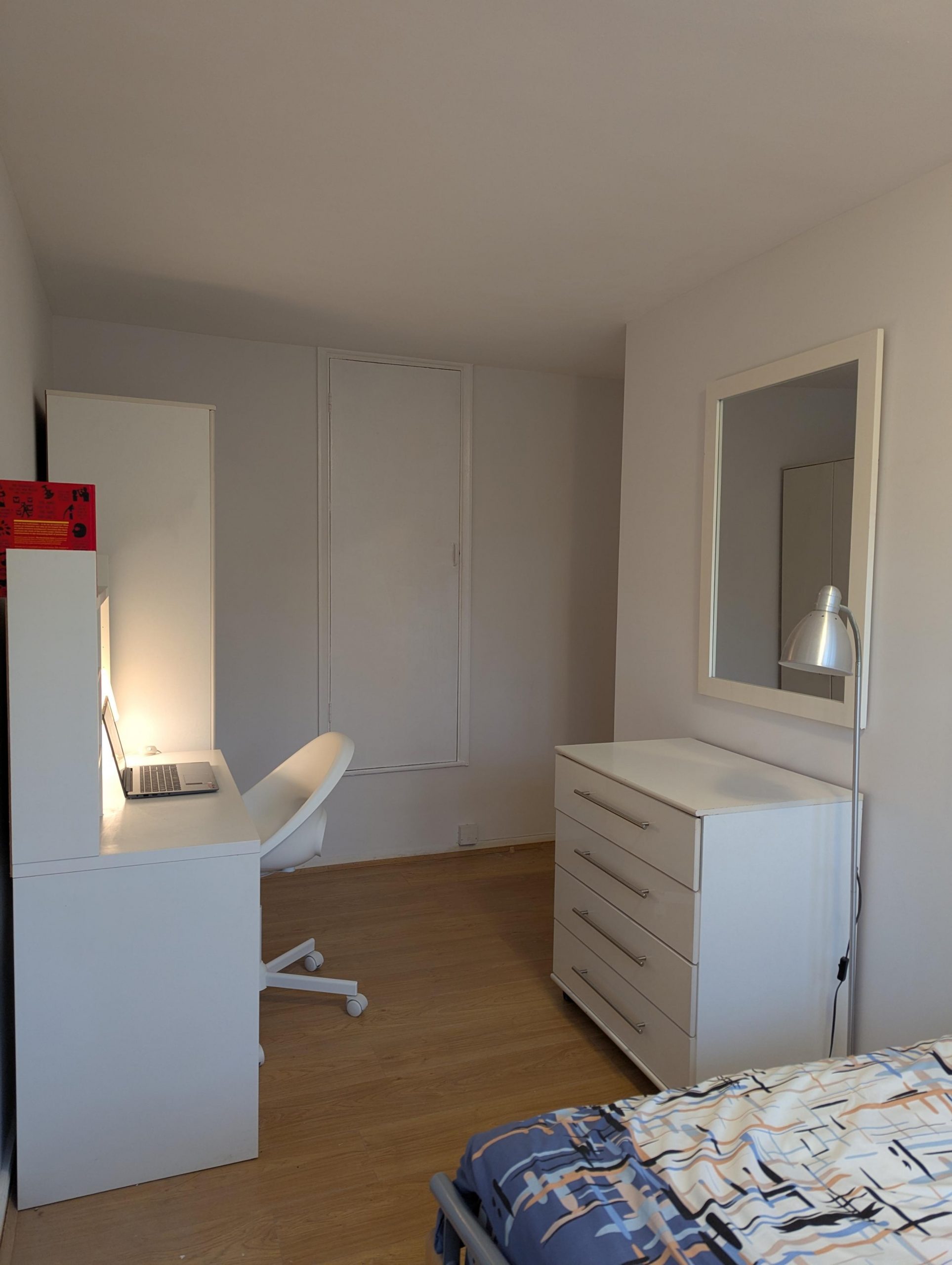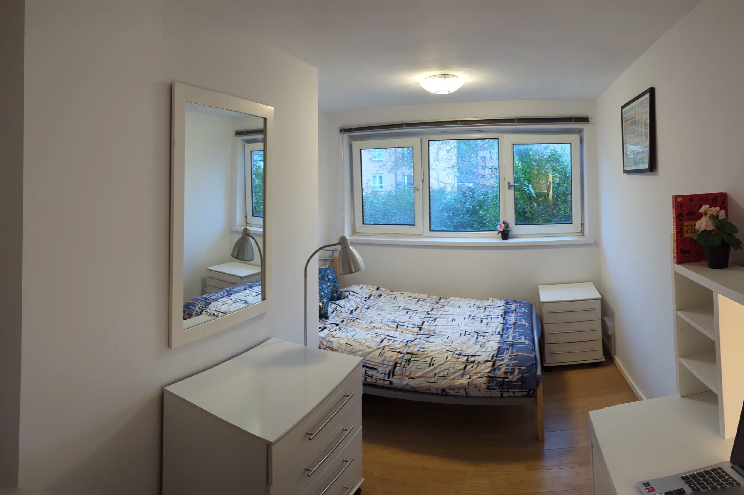 A very generous sized room with double bed, wardrobe, chest of drawers, desk and chair for home working, and a large window to let in ample natural light. Wooden floors elevate the room and create a modern, spacious feel.